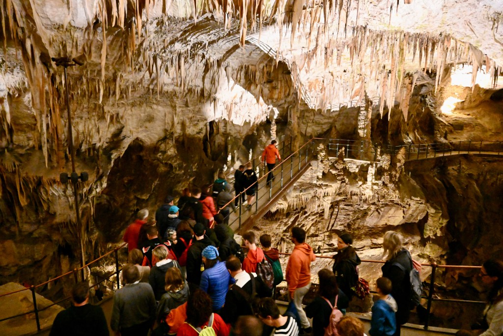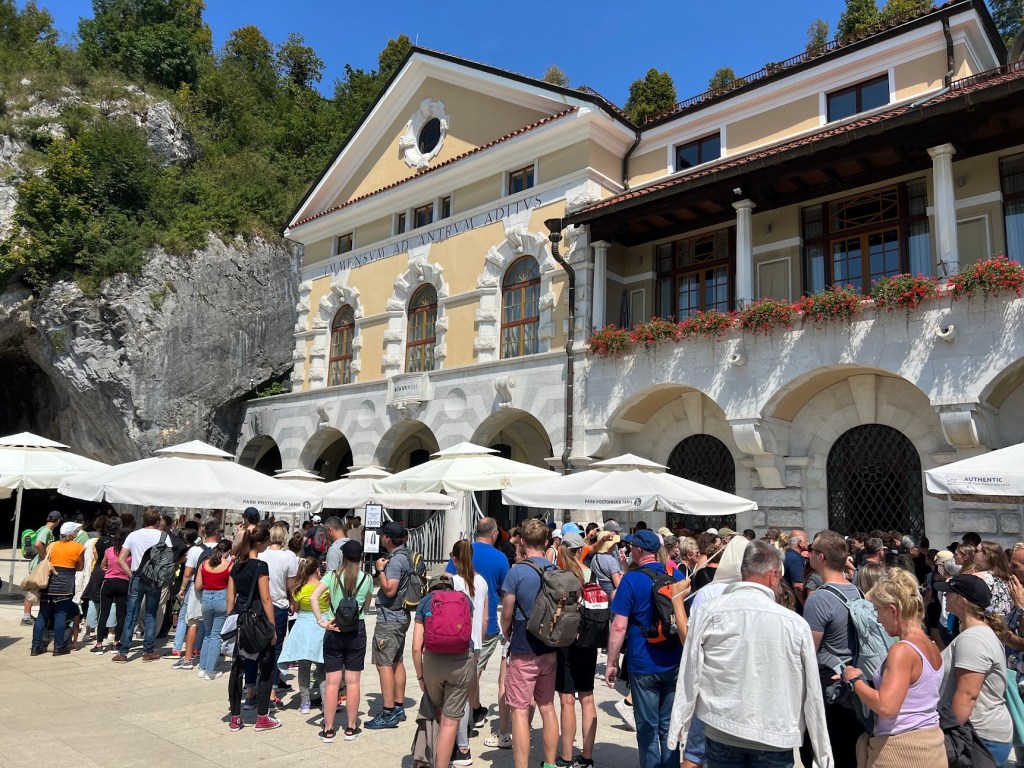 A Caverna Postojna é a principal atração turística da Eslovênia. É gigante, uma das maiores e mais belas da Europa. Possui uma ampla exploração turística. Como estávamos numa excursão da “To do in Eslovênia”, não tivemos dificuldades com os ingressos e entramos rapidamente, apesar da fila gigantesca para o acesso.