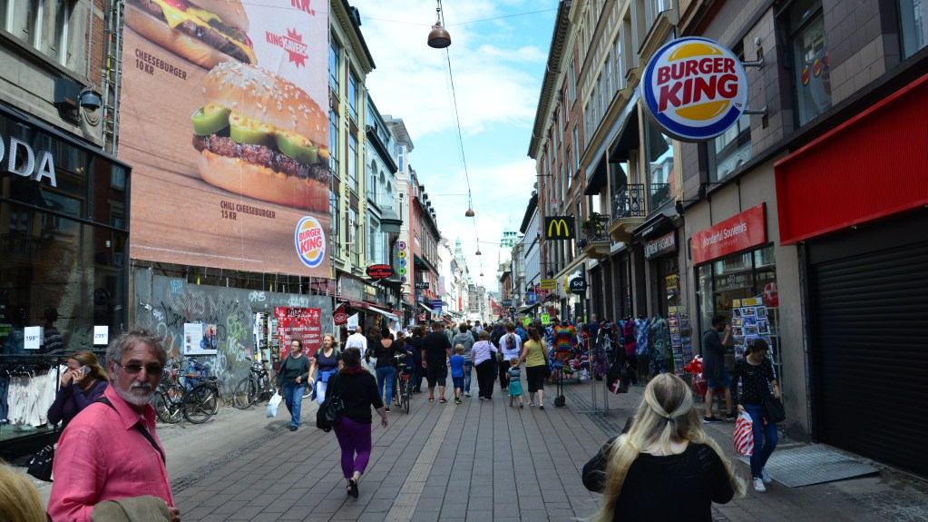 O nosso hotel ficava muito perto da Stroget, a famosa rua de pedestres, considerada a mais longa do Mundo com essa característica, no centro de Copenhague. A Stroget fica no coração da cidade, possui muitas lojas de grifes, design, móveis, porcelanas e cristais, esses produtos são destaques na Dinamarca.