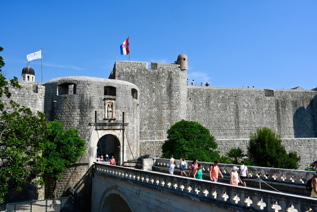 Seguimos direto para a cidade murada para aproveitar o final de tarde. A Dubrovnik antiga é a mais importante cidade totalmente murada do mundo. As muralhas são impressionantes, somam cerca de 2km de paredões, bem conservados, cercada de fossos e que em algumas áreas chegam a 6m de largura. Foram erguidos no século XVI. Essa é a principal atração turística do lugar.