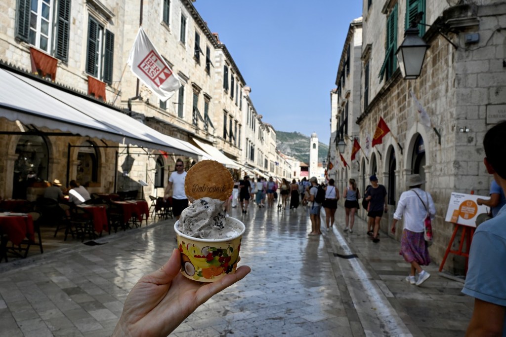 Passeamos pelas ruas da Dubrovnik antiga. A avenida principal chama-se Stradum, ou Placa, que divide essa parte da cidade ao meio. Uma linda rua de pedestres cheia de galerias de arte e lojas de lembranças e artesanatos da Croácia . Ela segue desde o portão principal de entrada, o Pile Gate, até o Ploce Gate, o portão que dá acesso ao porto antigo. A Stradum fica lotada de turistas e locais, sobretudo nas tardes quentes de verão.