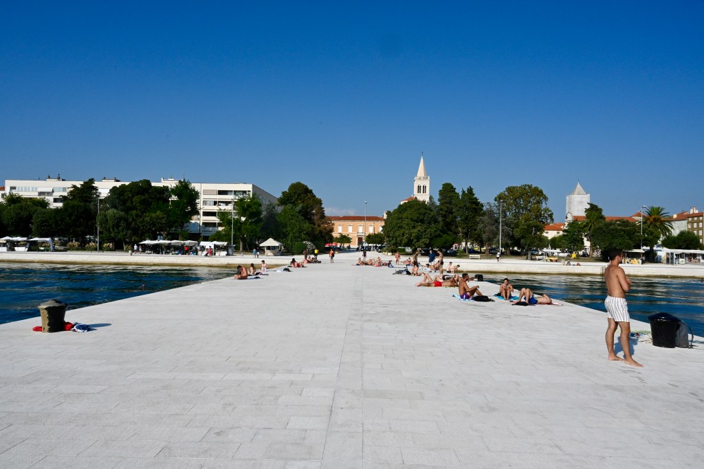 Chegamos até o Órgão do Mar, uma das atrações mais curiosas da cidade. É uma espécie de instrumento musical tocado pelas ondas que se lançam sob o píer da orla. O Órgão foi projetado em 2005 pelo arquiteto Nikola Basic. É formado por 35 tubos submersos. O movimento das ondas empurra o ar para dentro dos tubos e o instrumento começa a tocar. Quanto mais forte as ondas, mais alto é o som do órgão. O local é excelente para um banho de mar.
