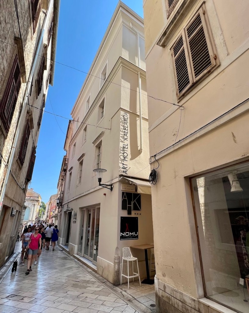 Chegamos em Zadar, no litoral da Croácia e procuramos o charmoso Art Hotel Kalelarga, que fica dentro da cidade murada. Já sabíamos que não conseguiríamos chegar lá com o nosso carro. Conseguimos estacionar nas vagas rotativas que existem ao lado da muralha da cidade e o mais perto possível do nosso hotel. Daí em diante tínhamos que seguir caminhando pelas charmosas ruelas da cidade antiga de Zadar. Precisávamos revalidar o estacionamento a cada 3 horas e isso era um perrengue que só resolvemos no dia seguinte. O Art Hotel Kalelarga fica num dos becos no interior da cidade murada de Zadar, num casarão antigo que foi totalmente adaptado para um Hotel Boutique maravilhoso.