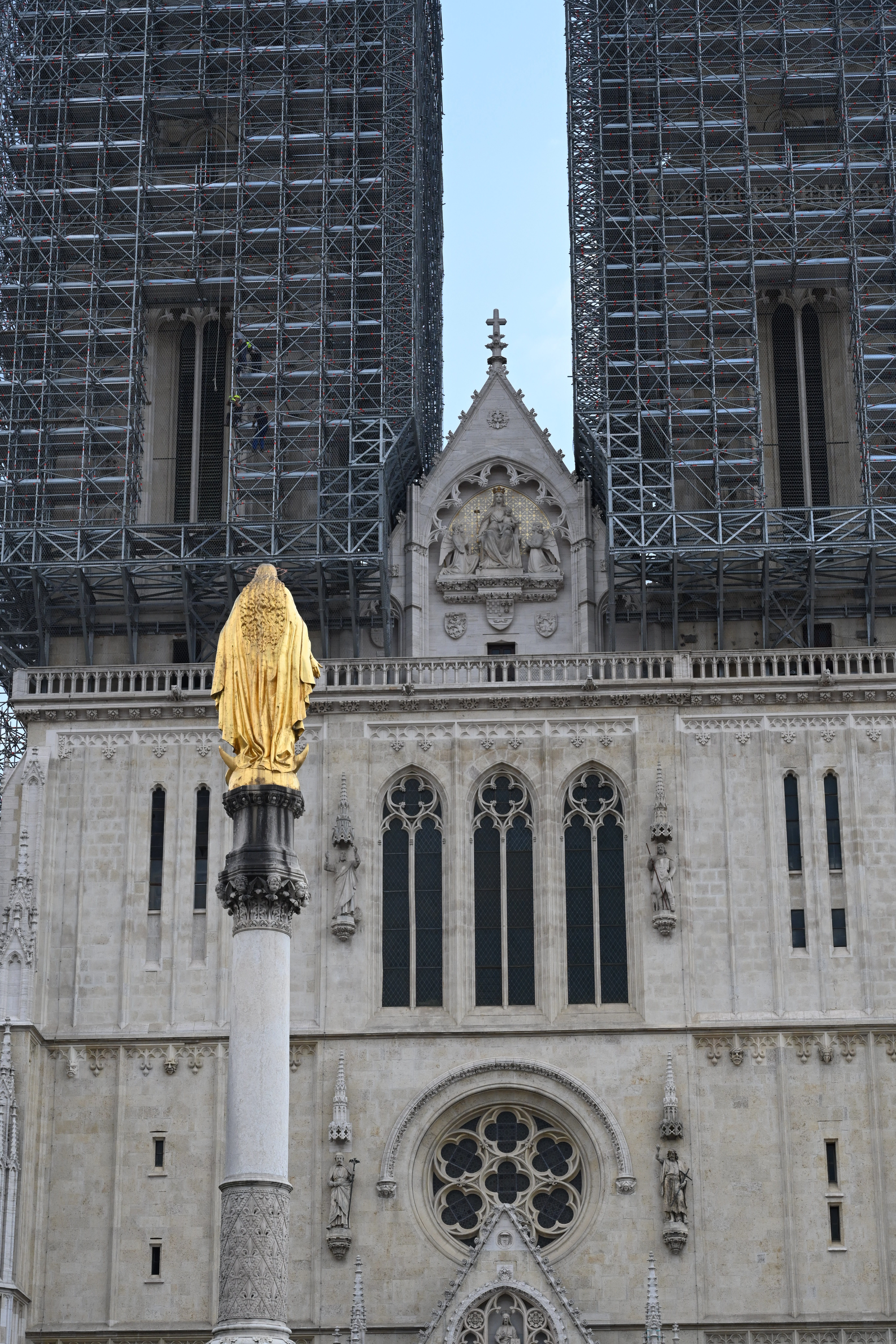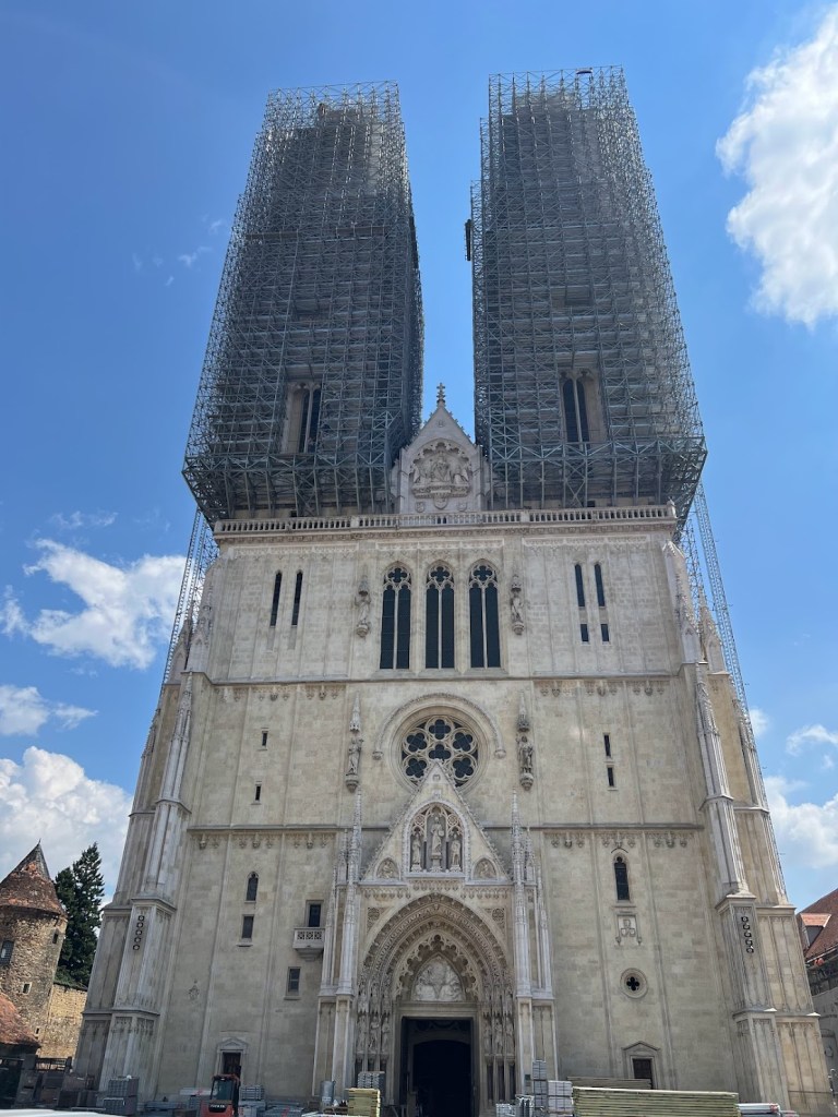 Seguimos caminhando pela Cidade Alta até a praça da Catedral de Zagreb. É o segundo edifício mais alto da Croácia e o maior monumento religioso do país. Uma catedral em estilo gótico com duas grandes torres frontais, com 104 metros de altura. Uma dessas torres foi gravemente afetada durante o terremoto de 2020 em Zagreb. Desde então, a Catedral está fechada para visitação ao público e passa por uma ampla reforma estrutural, para recuperar os danos provocados pelo terremoto.