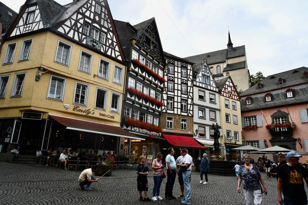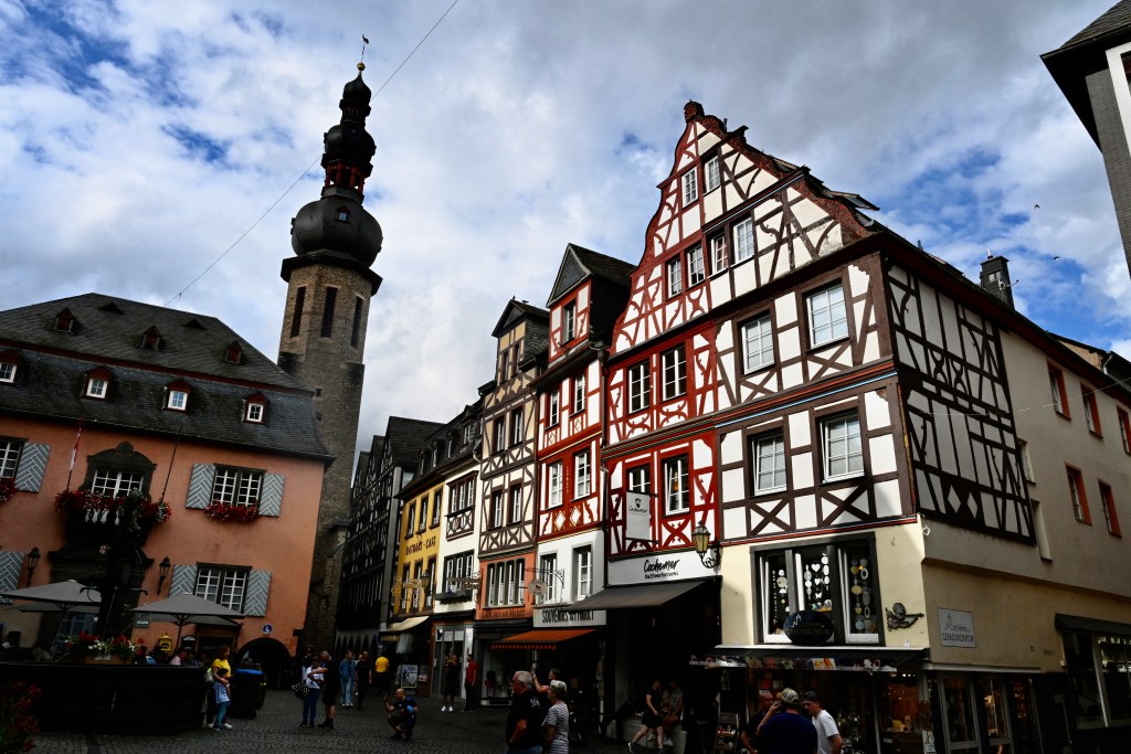 Terminamos a visita ao castelo e descemos a ladeira, passando por ruazinhas e becos em direção ao charmoso centrinho de Cochem, com suas casas de madeira, em enxaimel, restaurantes e cafés. A Praça do Mercado (Markplatz) é o centro da cidade, com casas antigas e edifícios em estilo barroco. No centro da Praça fica a fonte Martinbrunnen, de 1906.