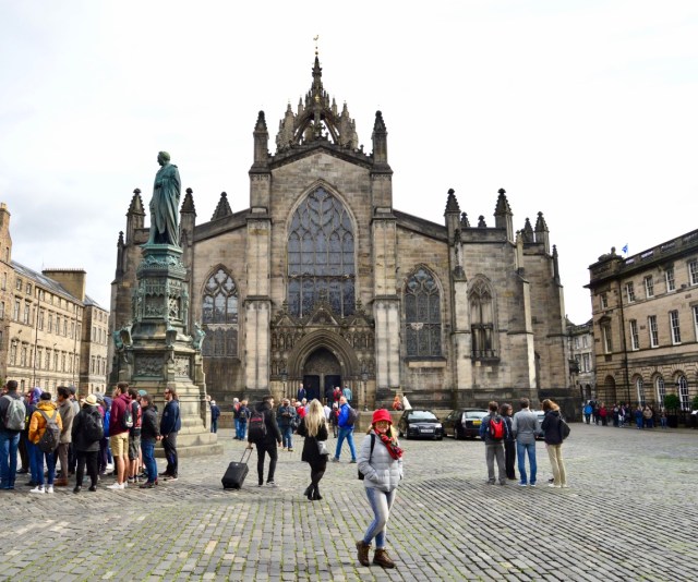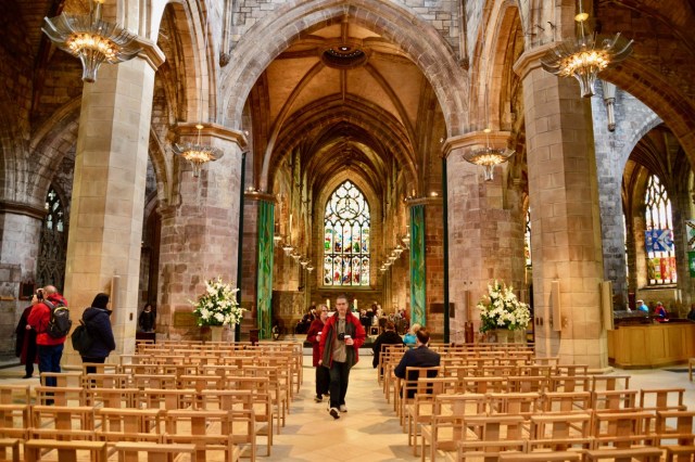 Como o Hotel Radisson Blu ficava dentro da Cidade Velha, saímos caminhando em direção ao Castelo e fizemos uma primeira parada na Catedral de Saint Giles (Santo Egídio), a maior igreja de Edimburgo, que já foi uma Catedral de fato, mas há muito não tem um bispo. Hoje é uma igreja presbiteriana. É considerada a Igreja Matriz do Presbiterianismo. No seu interior, predomina a riqueza da arquitetura gótica.