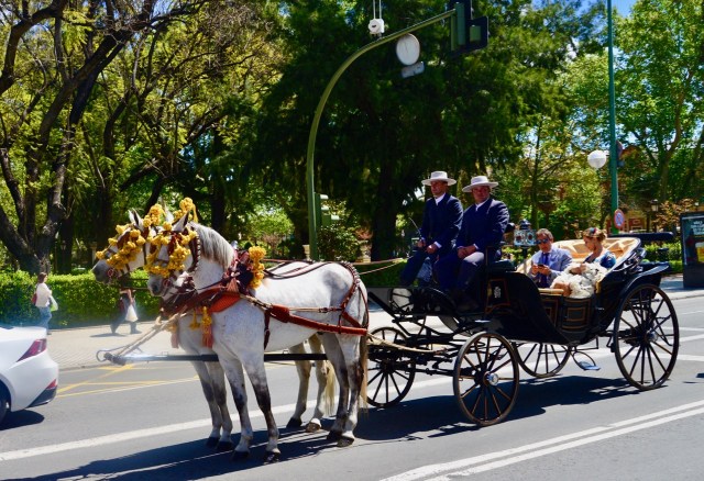 Sevilha estava cheia de carruagens elegantes com cavalos maravilhosos, algumas puxadas por burros espetaculares. Era a semana da Feria de Abril ou Feria de Abril, não resistimos, fizemos um passeio de carruagem pelo centro histórico da cidade e pelas suas principais atrações.