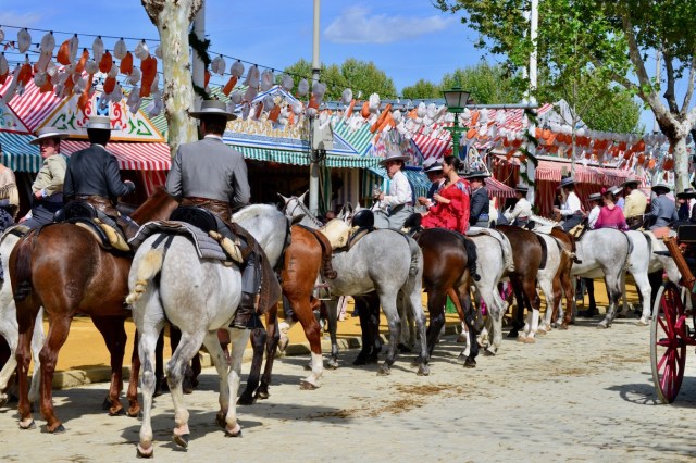 Durante o dia, homens e mulheres em trajes típicos desfilam animados em cavalos e carruagens. Param em cada tenda para beber o reburrito, uma bebida típica local, além de conversar e exibir os seus belos animais. Para a Feira de Sevilha convergem pessoas de toda a Espanha e hoje, do mundo inteiro.