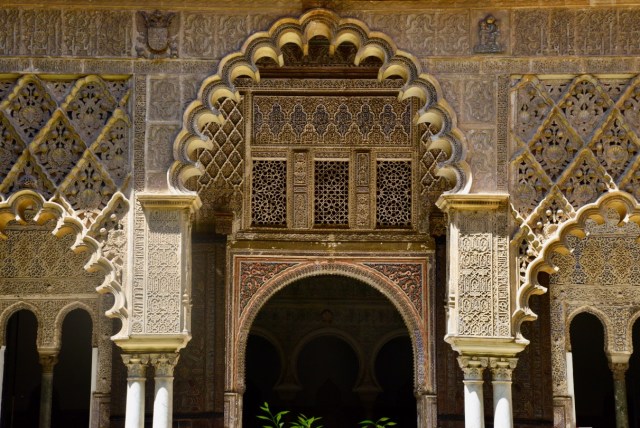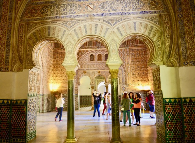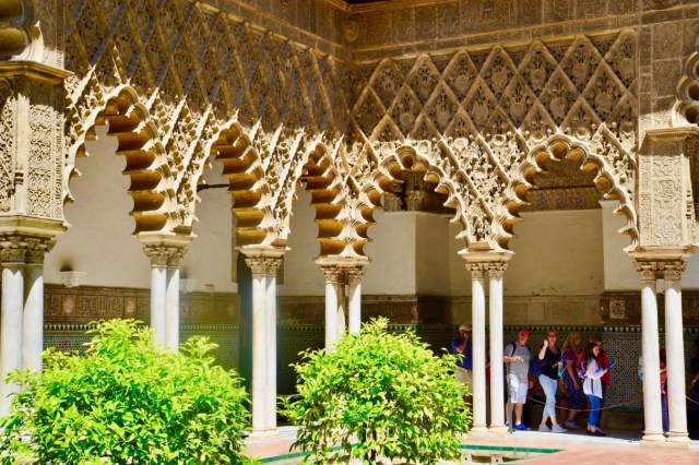 Após visitar a Catedral de Sevilha, seguimos para o Real Alcázar, que fica ao lado. O Palácio é o melhor exemplo de arquitetura em estilo mudéjar da cidade. A região da Andaluzia foi a que mais sofreu influência árabe. Foi a última região de ocupação moura da Península Ibérica.