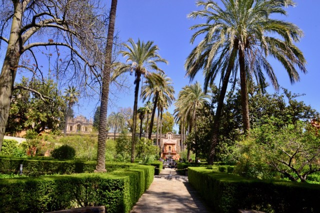 Os jardins do Palácio possuem terraços, fontes e pavilhões que ocupam uma grande área externa, o que ameniza o calor do centro de Sevilha.