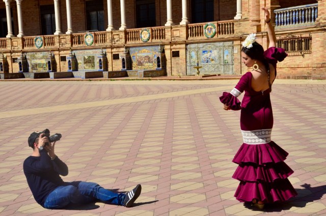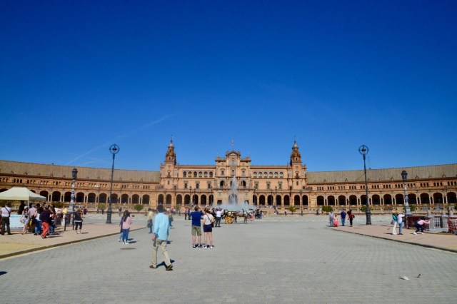 A cidade estava lotada de turistas em função da Feira de Abril e a Plaza de España era um dos lugares mais visitados. Muitos turistas fazem fotos especiais com os detalhes da praça como moldura.