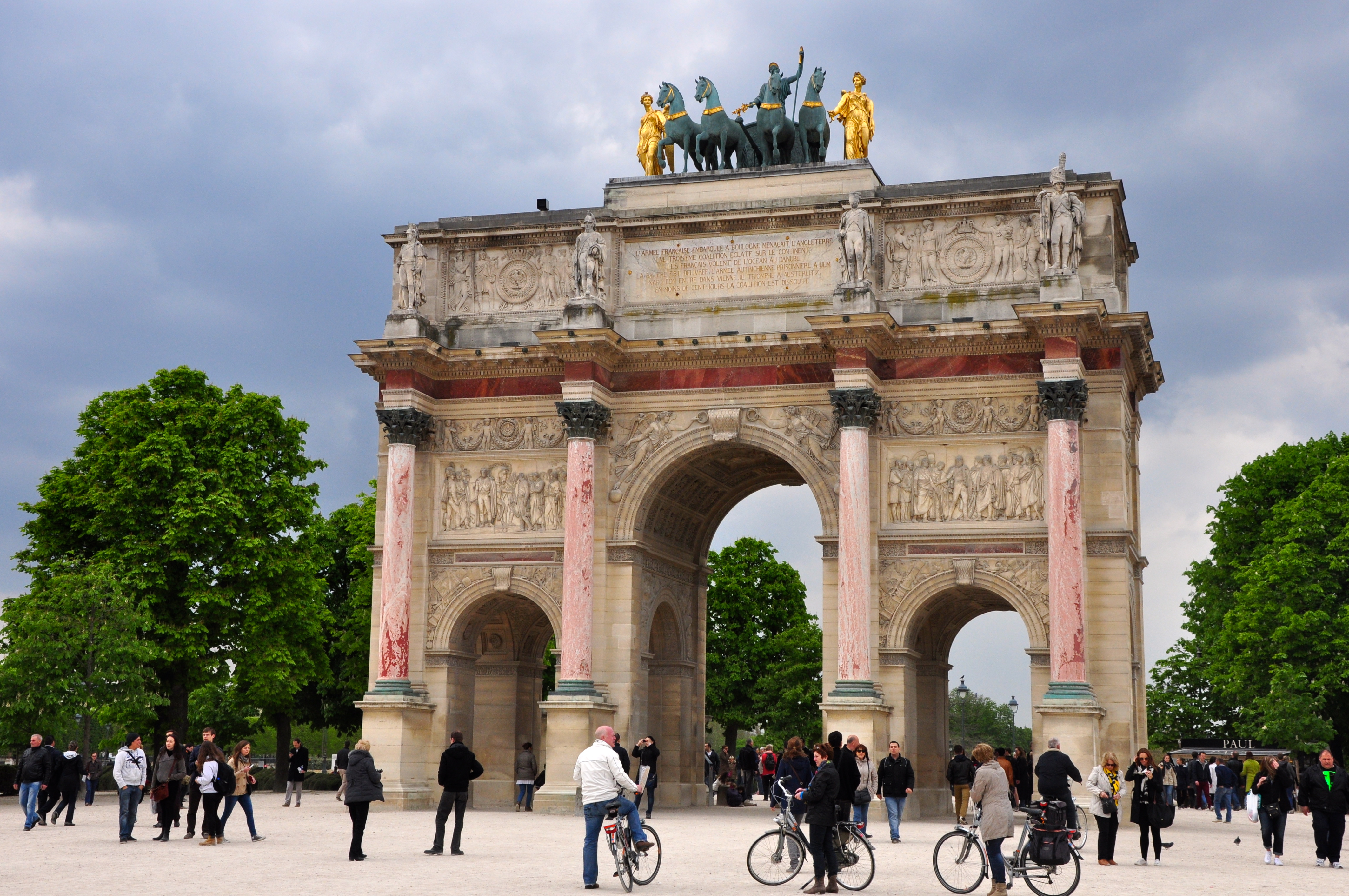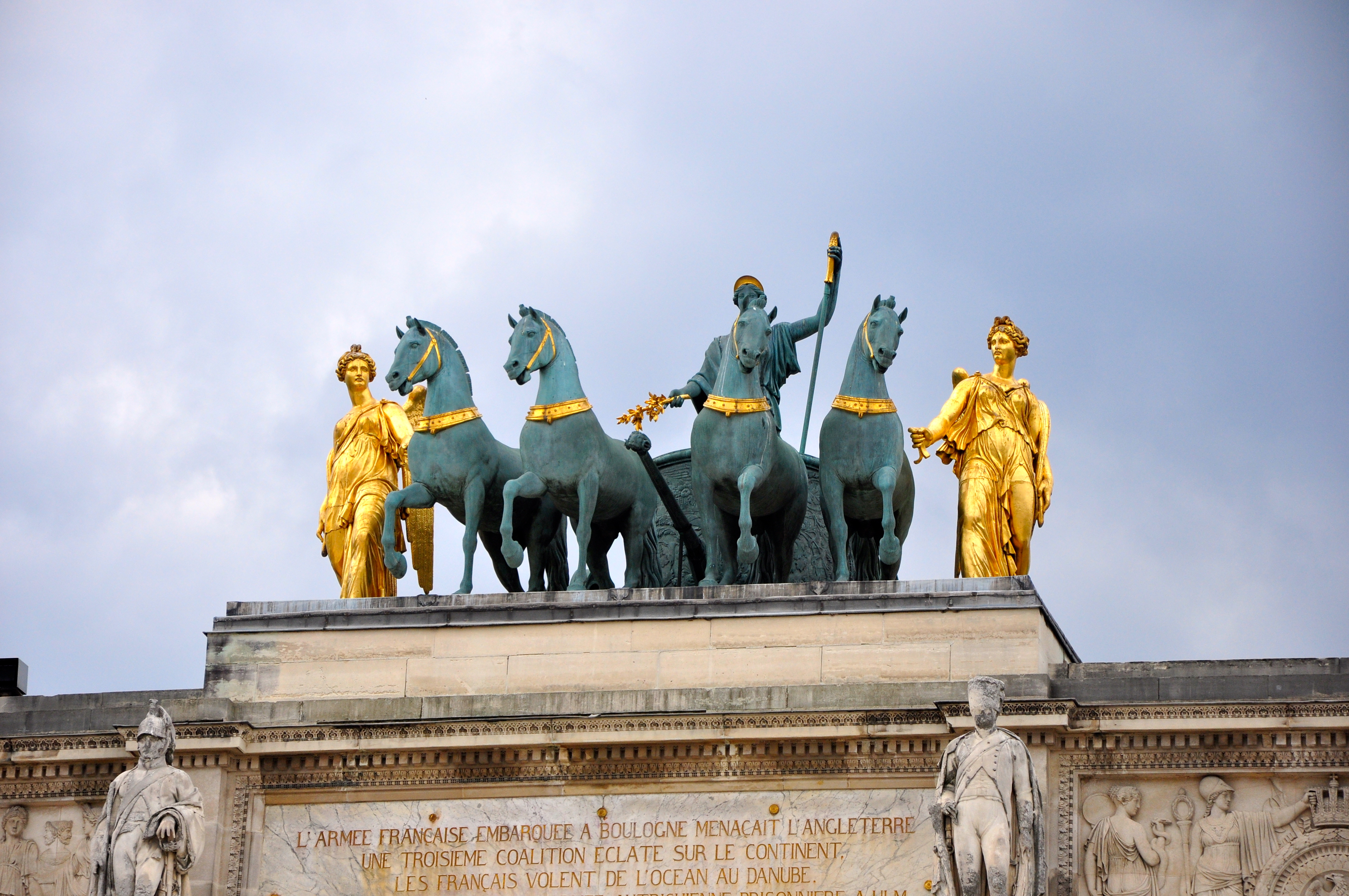 No alto do Arco existe uma notável quadriga. Uma cópia dos Cavalos de Bronze de Constantino que ficam na parte superior da Basílica de São Marcos em Veneza. Os Cavalos originais (de Veneza), já foram colocados ali quando as tropas de Napoleão voltaram da Primeira Campanha da Itália (1796-1797) e o general (Napoleão Bonaparte) trouxe o tesouro de Veneza como troféu de guerra. Com a derrota de Napoleão em Waterloo, a quadriga foi devolvida à Veneza.