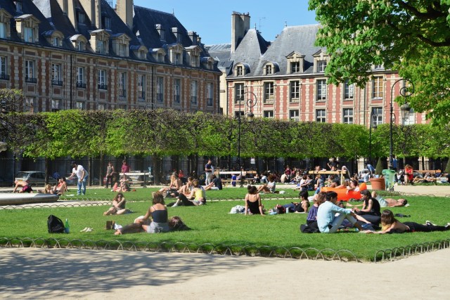 No centro da praça um grande jardim. Estávamos em um dos primeiros finais de semana ensolarados da primavera parisiense e a praça estava cheia. Muitos dos parisienses, ansiosos pelo sol, ficam deitados na grama como se estivessem numa praia.