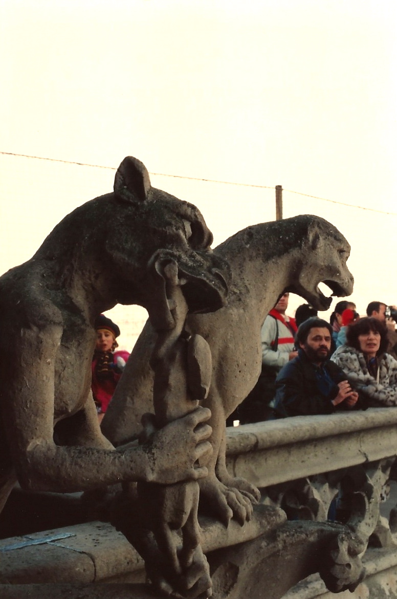 Um dos destaques da Catedral de Notre Dame é o conjunto de gárgulas e quimeras que aparecem por todos os lados. As gárgulas são figuras mitológicas assustadoras, que têm uma função estrutural, pois são as áreas de escoamento das águas pluviais coletadas pelo telhado. As quimeras se assemelham às gárgulas, mas não têm função de escoamento de água, são apenas decorativas.