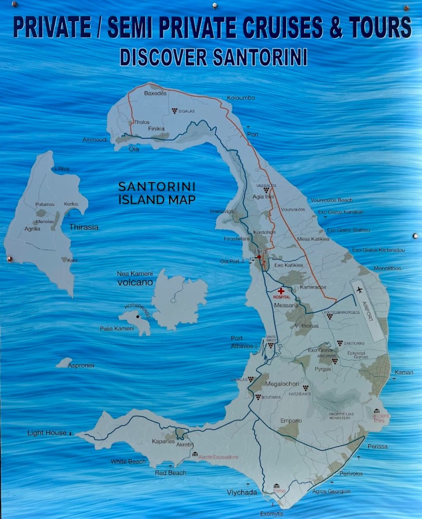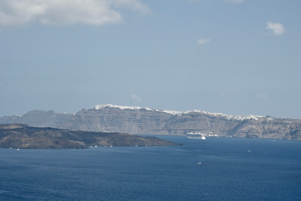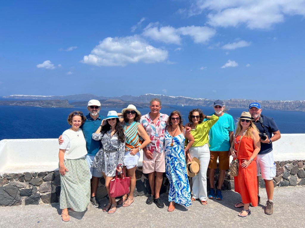Pegamos um voo da Companhia grega Angean para Santorini, na Grécia, com conexão em Atenas. São 1:15h de voo até Atenas, tivemos 2 horas de conexão e embarcamos para Santorini num voo em uma aeronave turboélice da SKY, uma companhia low cost da Grécia. São uma hora de voo entre Atenas e Santorini. Na chegada em Santorini, pegamos um táxi no aeroporto e seguimos de van até o Gizis Exclusive Hotel onde ficamos hospedados por duas noites. Não gostamos do hotel. Bastante simples e qualidade ruim dos apartamentos e serviços. A única coisa que é igual aos outros é a vista incrível da baía de Santorini. Demos azar. O grupo ficou dividido em quatro 4 hotéis diferentes. No verão lotado da Grécia, não estava sendo fácil encontrar um único hotel que atendesse a todo o grupo. Todos os hotéis foram na vila de Imerovigli.