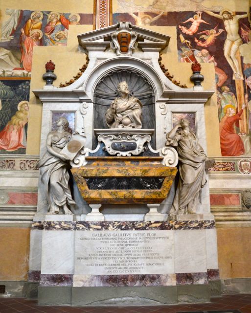Galileu Galilei nasceu em Florença, no ano em que Michelangelo morreu, 1564. Astrônomo fenomenal, defendeu a teoria de que a Terra girava em torno do Sol e não ao contrário. Por isso foi julgado e condenado pela Santa Inquisição. O seu corpo ficou abandonado por muitos anos, apenas em 1737 foi levado para a Basílica da Santa Croce e ganhou um lugar de destaque em frente a Michelangelo.