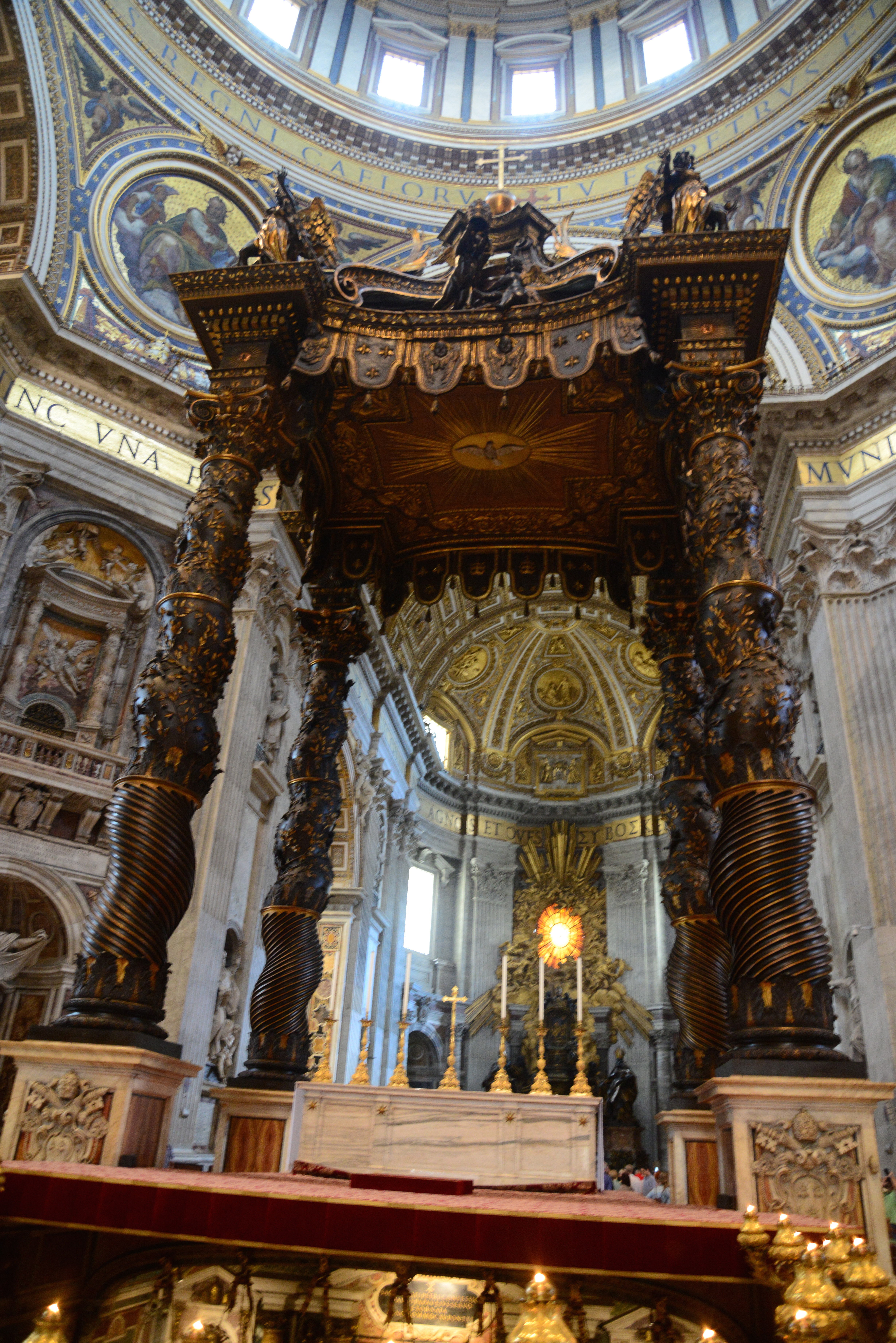 Bernini, que projetou o magnífico Baldaquino de São Pedro, em mármore preto com detalhes dourados, encomendado em 1624 pelo Papa Urbano VIII.