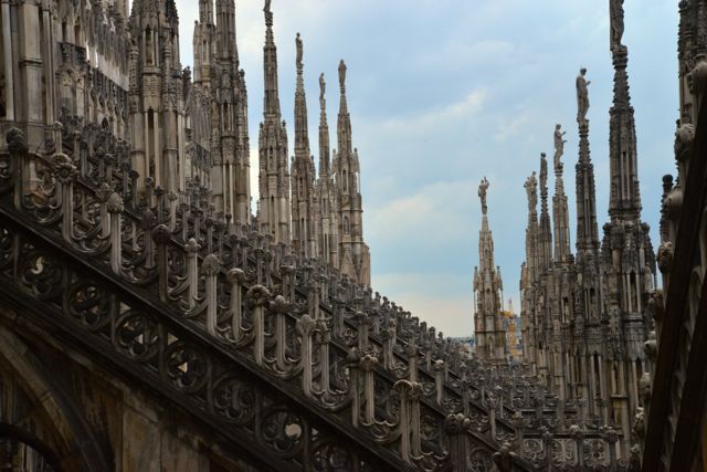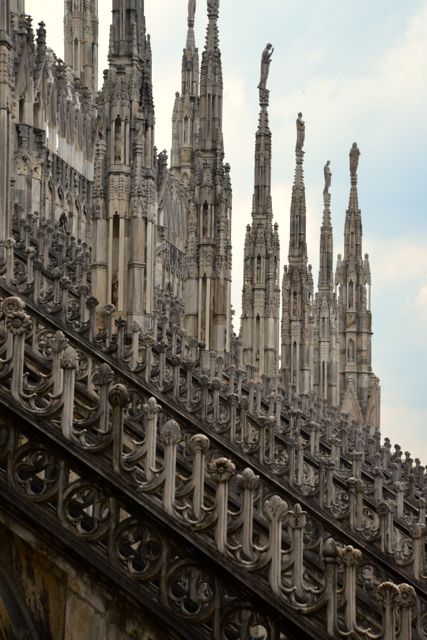 Depois que visitamos a Catedral, seguimos para a grande torre, onde pegamos um elevador que leva aos telhados da igreja. Lá de cima temos uma bela vista da cidade e sobretudo da Praça do Duomo. O que mais chama a atenção, porém é a exuberância de detalhes das igrejas góticas.