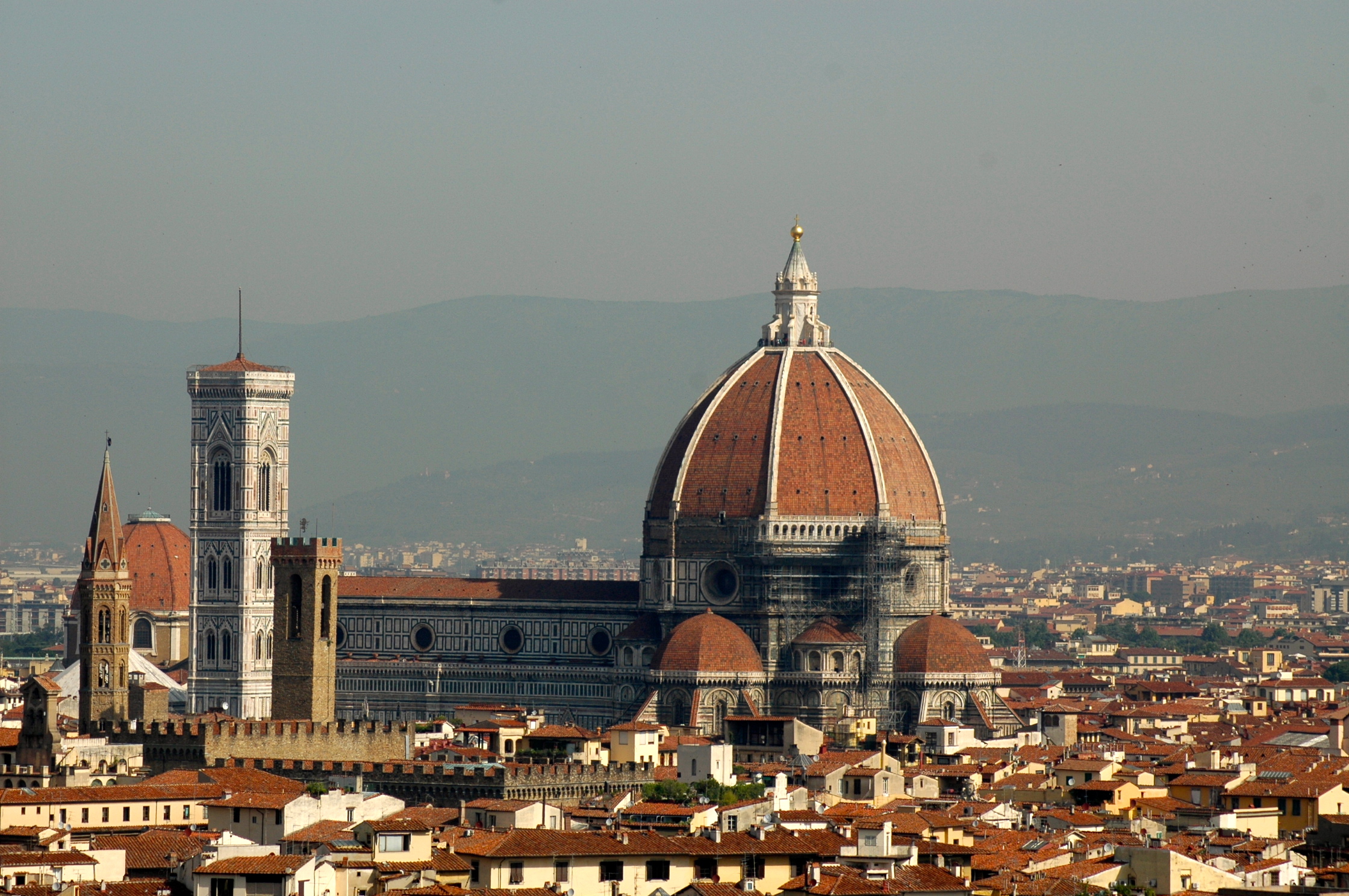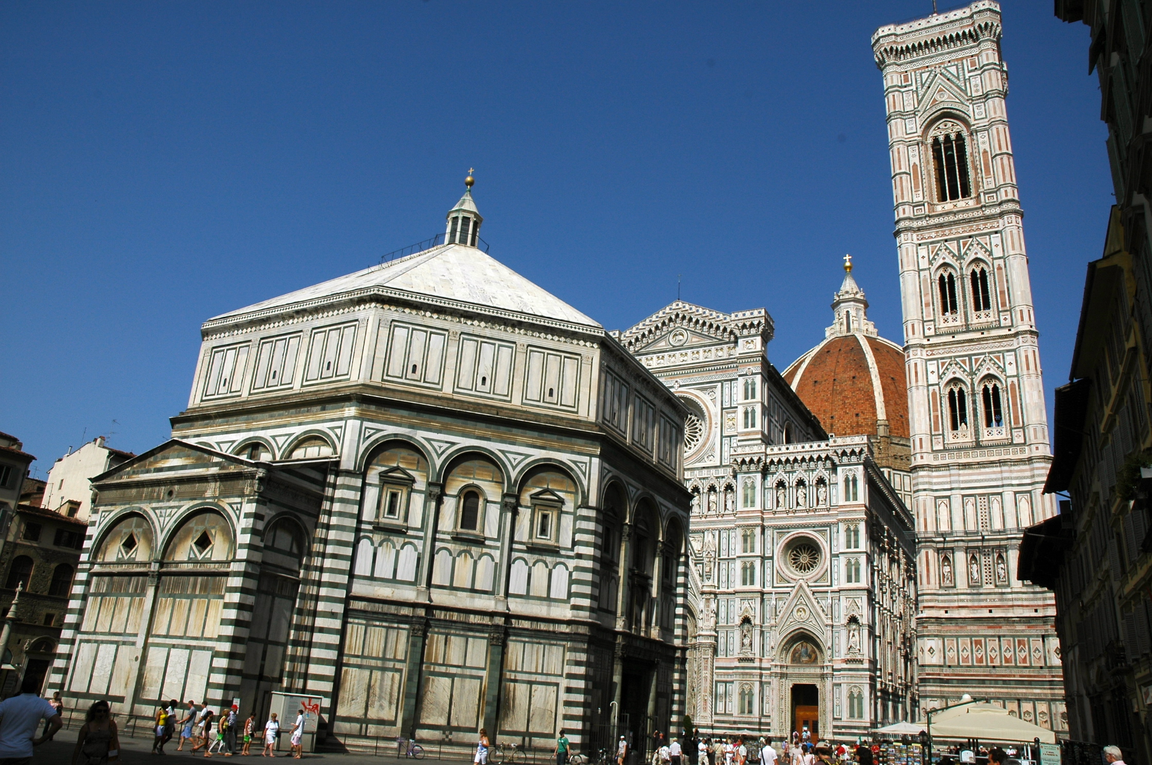 O centro histórico de Florença é compacto e denso. Na praça do Duomo, a igreja de Santa Maria del Flore divide as atenções com o Batistério e o Campanário, ricamente decorados com mármore e entalhes de baixo relevo.