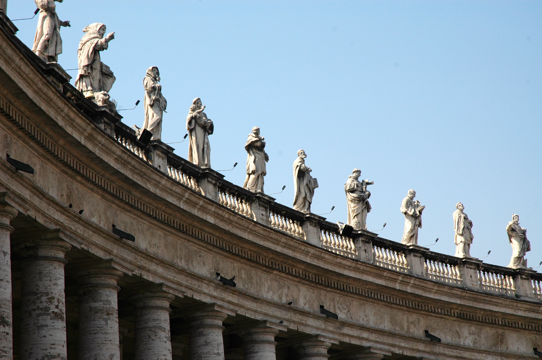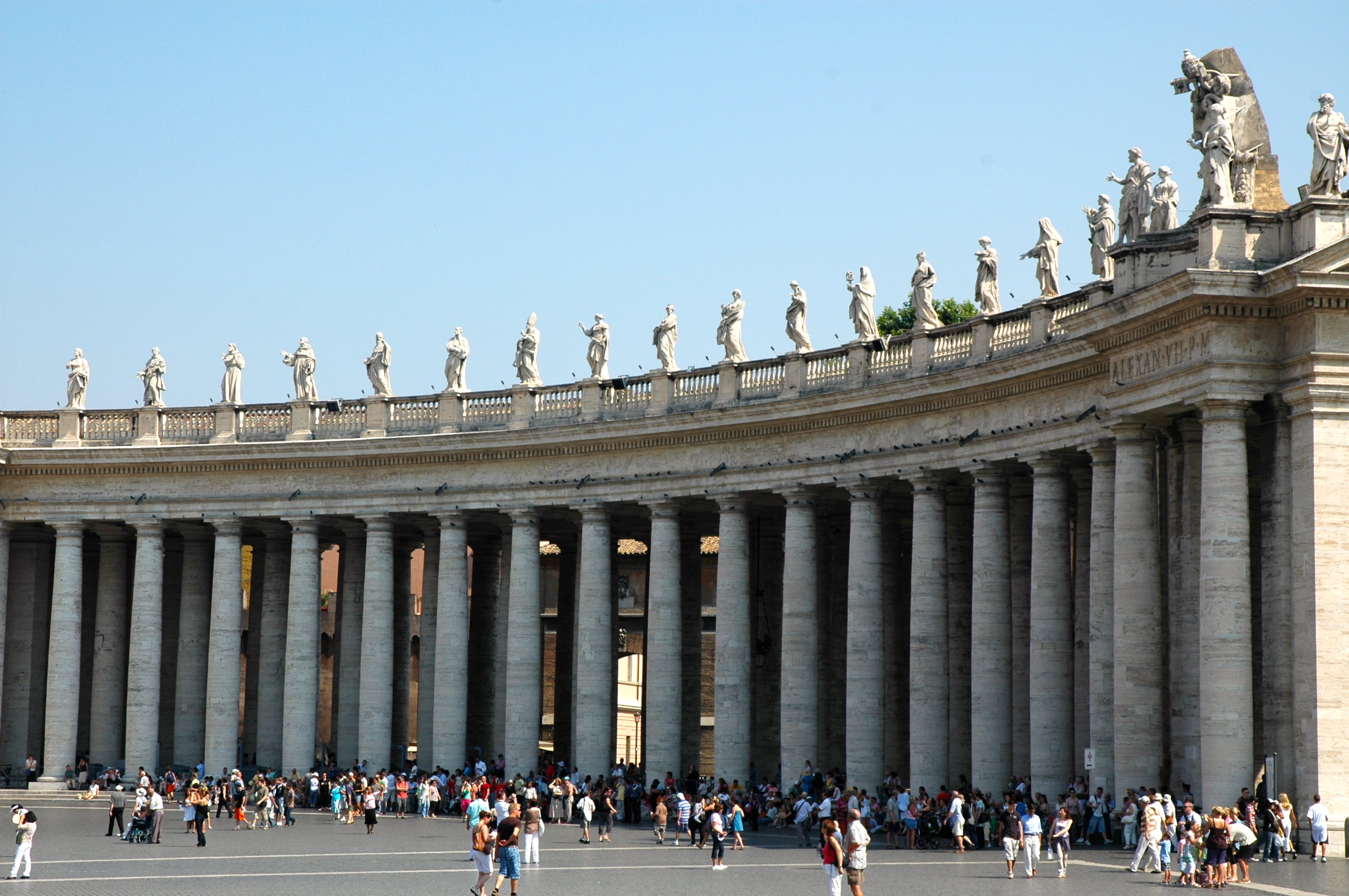 A Praça de São Pedro tem uma forma de elipse rodeada por colunas dóricas que simbolizam a Igreja Mãe. Há um corredor largo entre as colunas onde podem passar carros e pessoas.
