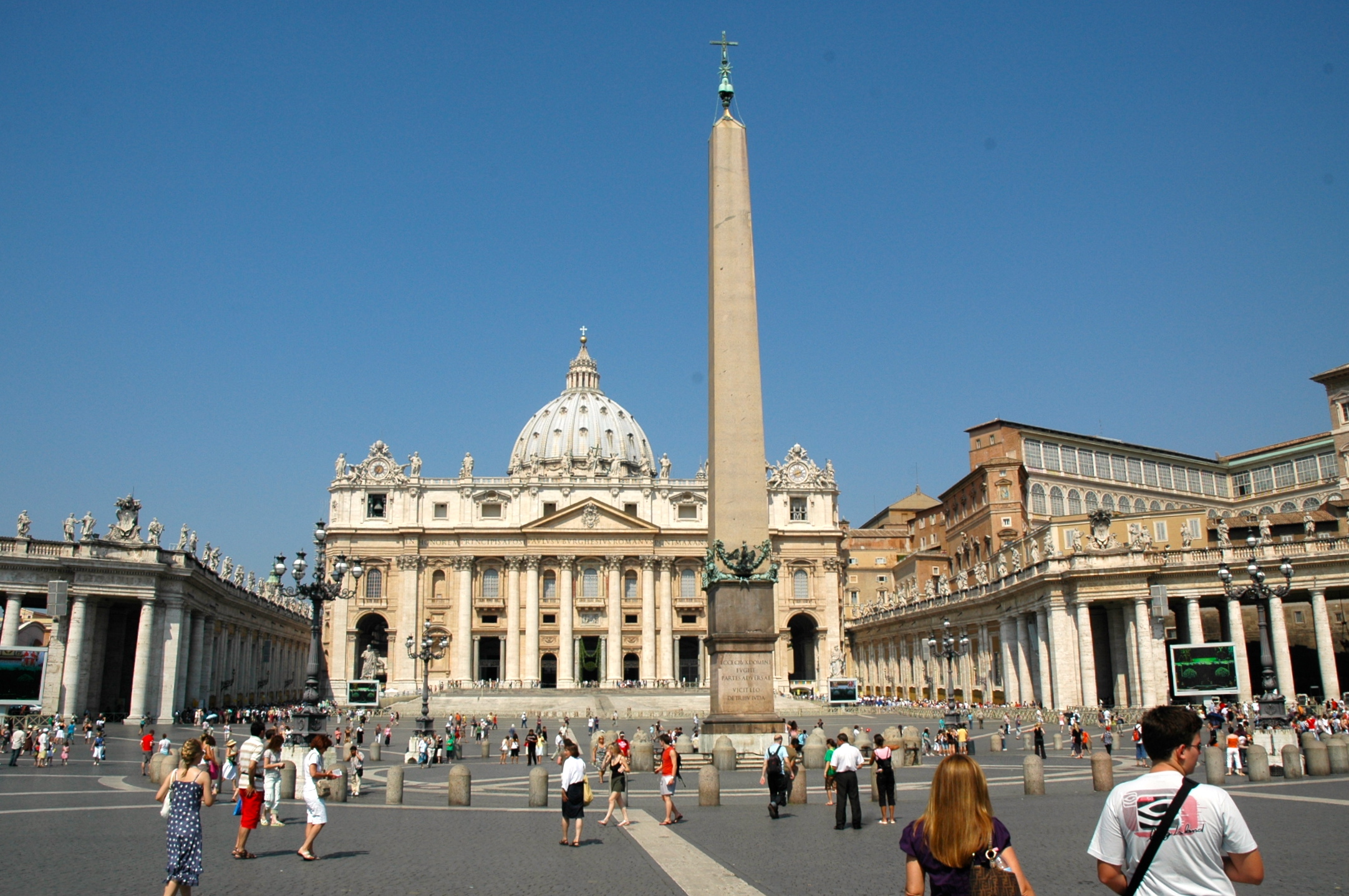A melhor forma de chegar ao Vaticano é pela Praça São Pedro, em frente à Basílica de São Pedro. A Praça foi criada por Bernini entre 1656 e 1667 em estilo clássico com toques de barroco. No centro existe um obelisco egípcio com 40 metros de altura colocado ali desde 1585.