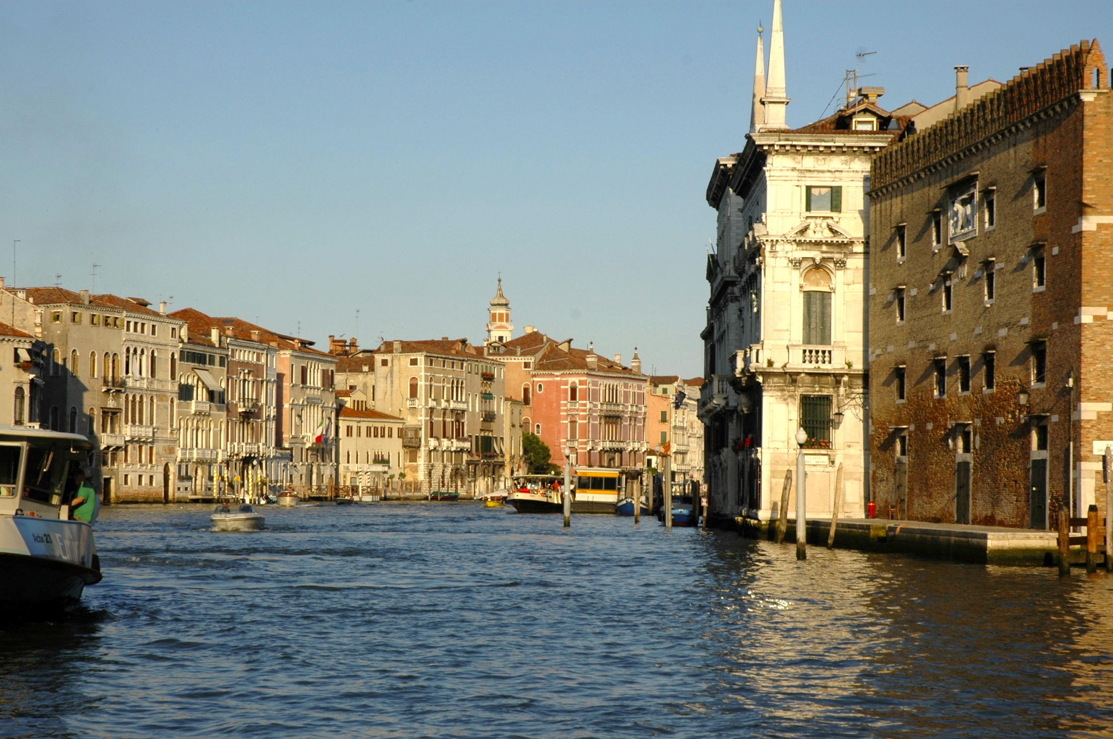 Pegamos um vaporetto na Piazzale Roma, o ticket é caro, mas tudo em Veneza é caro, por motivos óbvios. Seguimos através de Grande Canal até a Praça de São Marcos, no coração de Veneza. Daí seguimos a pé até o nosso hotel. Como circular pela cidade é difícil, é importante levar apenas uma mala de mão, pois obrigatoriamente vamos carregá-la em algum lugar.