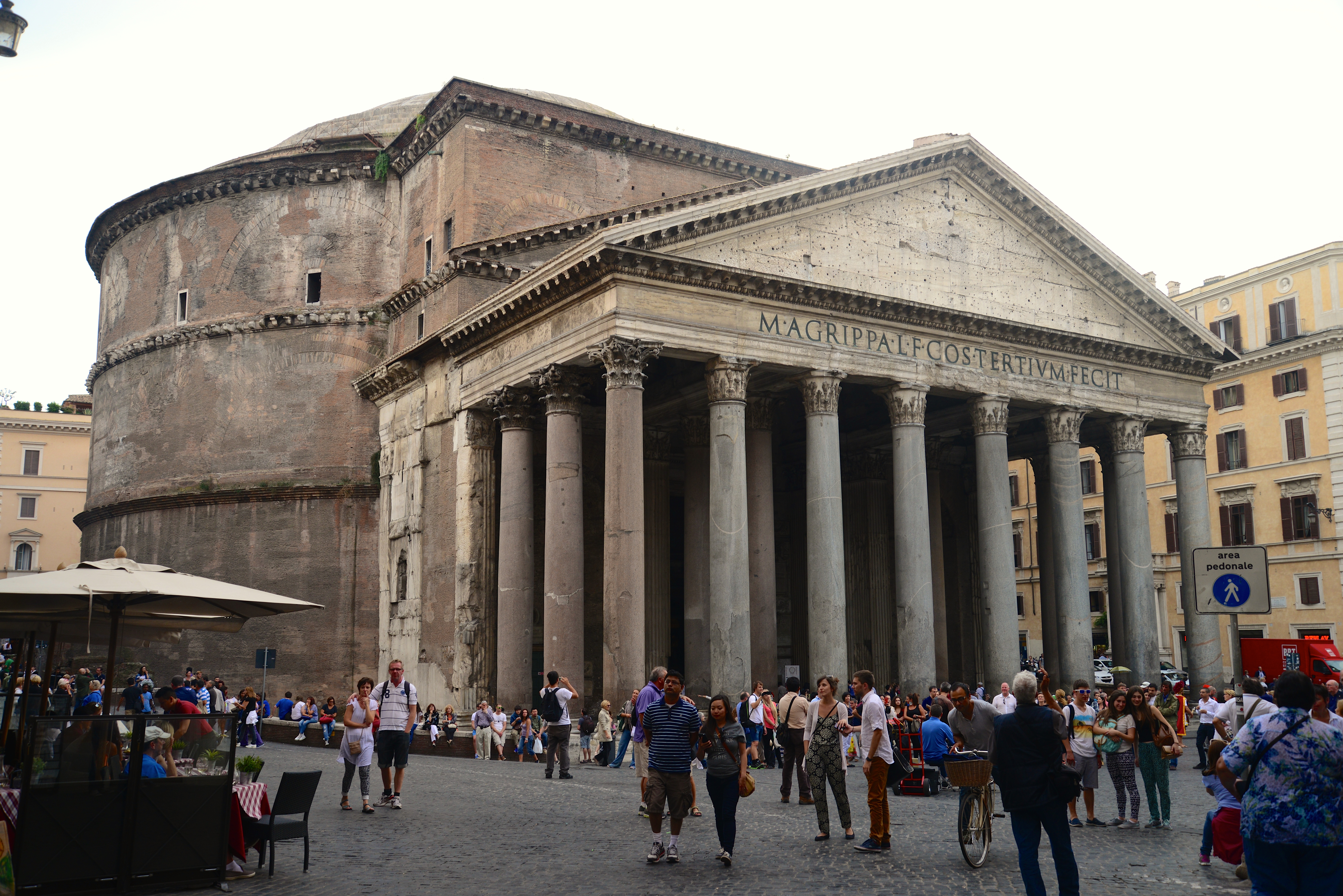 Chegamos ao Panteão, um dos monumentos mais impressionantes em Roma, pois de todos os edifícios históricos romanos, o Pantheon (Panteão), ou Pantheon de Agripa, é o único perfeitamente preservado e que foi originalmente construído na época greco-romana, no século 27 a.C., por Agripa, no período da República Romana, possuía um projeto retangular convencional.