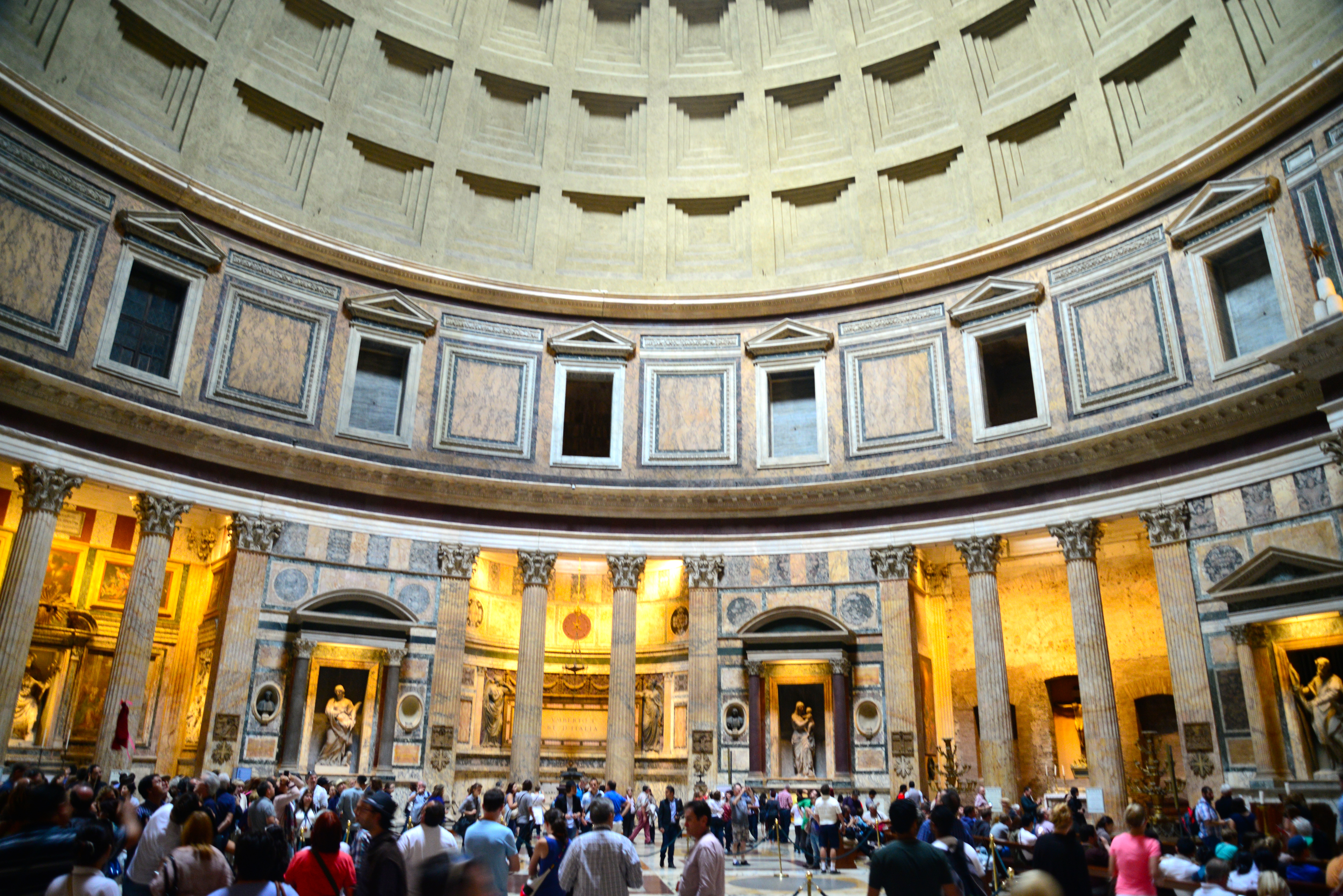 No interior do Panteão um incrível, grande domo hemisférico possui o raio equivalente à altura do cilindro, o que garante proporções perfeitas e harmoniosas. No alto do cilindro, a abóboda impressiona pela imensidão e o óculo, uma abertura circular no teto, possibilita a entrada de luz que ilumina o interior do templo.