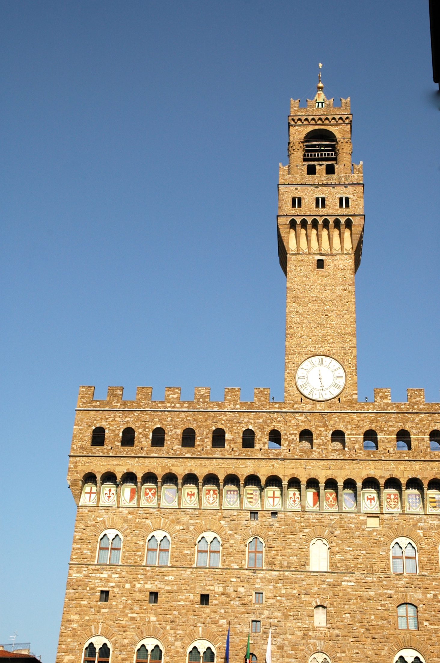 Ao lado da Loggia dei Lanzi fica o Palácio Vecchio, onde ainda funciona a prefeitura de Florença. O Palácio foi construído em 1322 e no alto da sua torre foi instalado um sino usado para convocar a cidade para reuniões. A Galeria Uffizi fica ao lado do Palácio Vecchio e é o maior museu de arte da Itália.