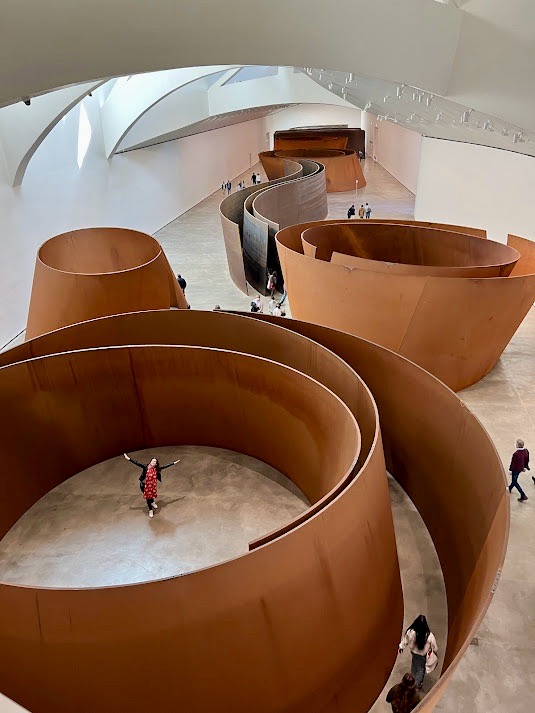Dentre as obras de arte moderna e contemporânea que estão em exposição permanente no Museu Guggenheim Bilbao, destaca-se a La materia del tiempo de Richard Serra. Um conjunto de sete esculturas gigantes, feitas em aço, sob encomenda para o Museu, que ficam num enorme salão do primeiro piso, ao lado de uma outra obra do mesmo artista, denominada “serpente”. As placas de aço formam um labirinto interativo entre as sete esculturas. Os visitantes são “convidados” a passar entre elas e vivenciam essa experiência.