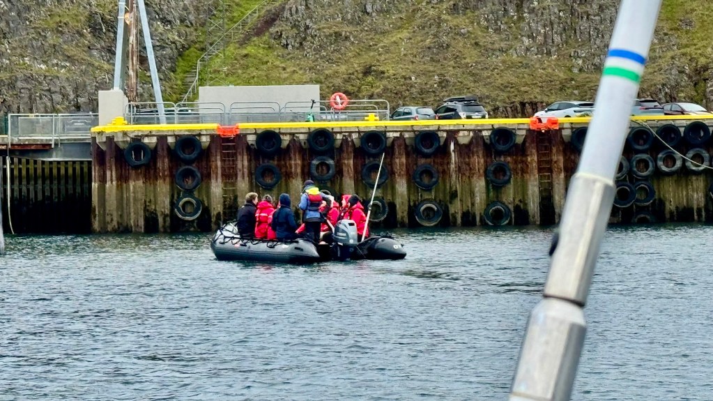 Em todas as paradas do Siver Wind, existiam algumas programações em terra e os hóspedes são estimulados a decidir previamente sobre qual o programa que querem fazer. A primeira descida nos Zodíacos não foi tão simples. O mar batia muito e molhava bastante. O frio era intenso, mas sobrevivemos. Chegamos em terra a Stykkishólmur e acompanhamos um dos guias que estavam disponíveis em terra, com um grupo do navio, contando as histórias do pequeno povoado.