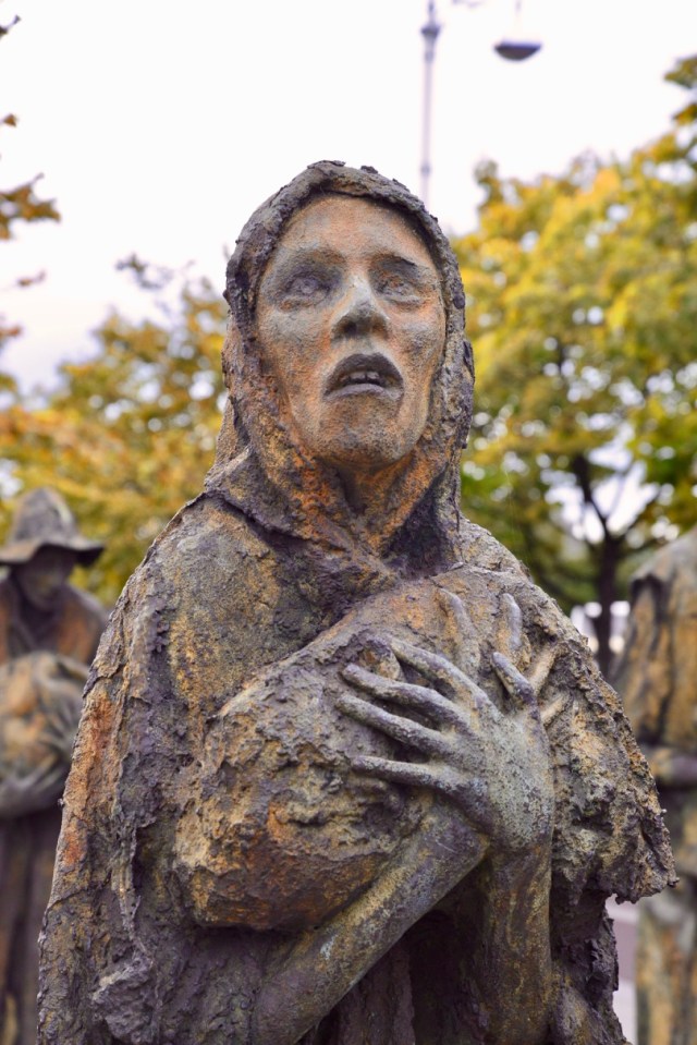 Durante essa caminhada, nos deparamos com uma das esculturas mais emocionantes de Dublin, presente do governo canadense à cidade. Ela homenageia as famílias irlandesas que, durante o século XIX, migraram em massa para o Canadá fugindo da Grande Fome. Esses imigrantes tiveram papel fundamental na construção do país do outro lado do Atlântico.