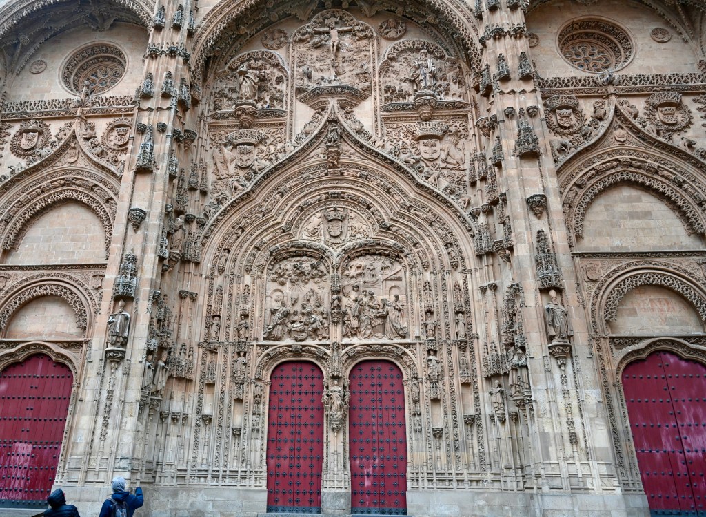 Saímos do museu e seguimos andando em direção ao centro histórico. Paramos na magnífica Catedral de Salamanca. Na realidade são duas que ficam coladas uma na outra. A Catedral Nova, do século XVI foi construída ao lado da Velha, que não foi destruída, e hoje são integradas, separadas apenas por uma porta. É uma catedral gótica, com toques de barroco e arquitetura renascentista. Um dos destaques fica para a fachada oeste, com um belíssimo trabalho de entalhe em pedra, com cenas religiosas.