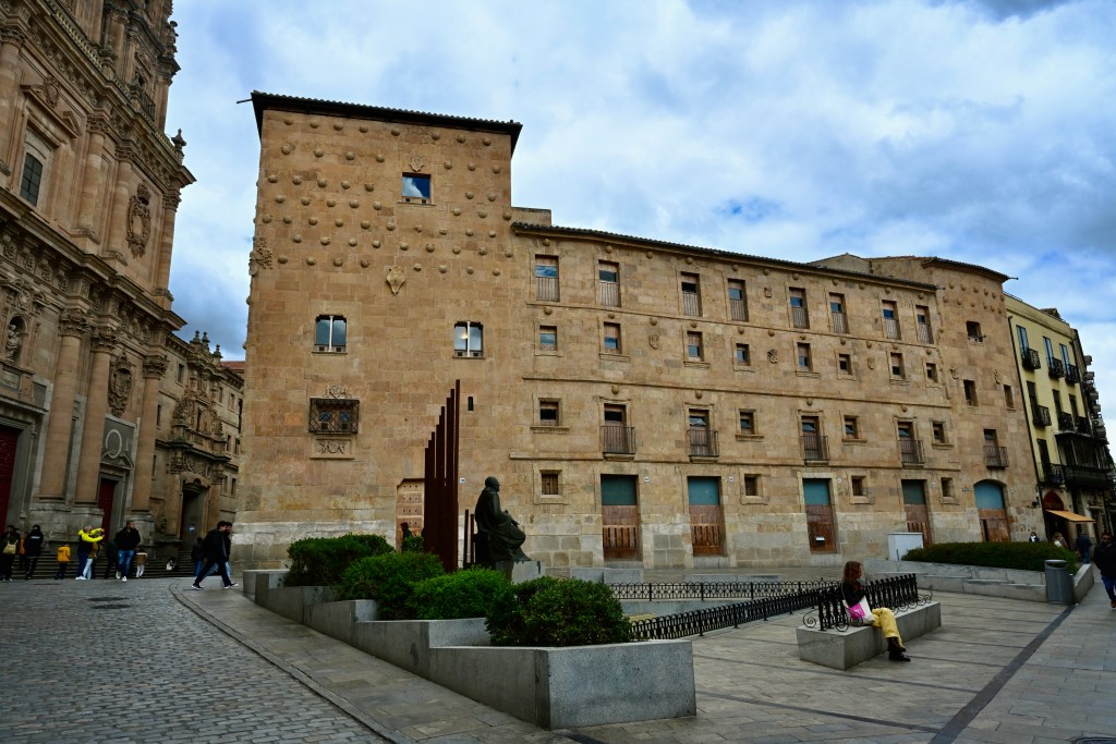 Saímos da Universidade de Salamanca e seguimos andando pelas ruas estreitas do centro histórico. No caminho aparece a icônica Casa das Conchas. Um belíssimo casarão com uma fachada ornamentada por centenas de conchas esculpidas na parede. As conchas são um símbolo dos Caminhos de Santiago. Salamanca é uma das passagens de peregrinos que vão em direção a Santiago de Compostela.