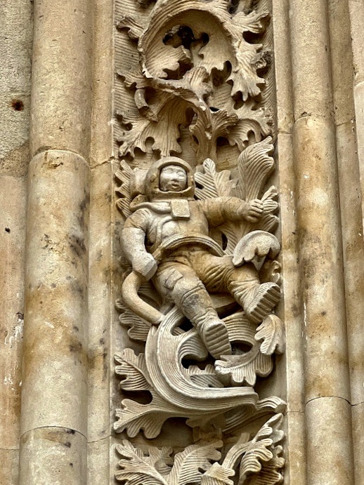 Uma das curiosidades da fachada oeste é a presença da figura esculpida de um astronauta nos entalhes do pórtico central. O pórtico é originalmente do século XVI, quando ainda não existiam as viagens espaciais. O astronauta foi colocado ali em 1992, quando aconteceu a reforma da Porta de Ramos que estava desgastada pelo tempo. Foi adicionada pelo pedreiro Miguel Romero, sem conhecimento e/ou autorização do arquiteto responsável pela reforma. Hoje virou uma atração à parte no pórtico da Catedral.
