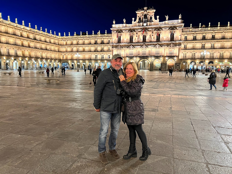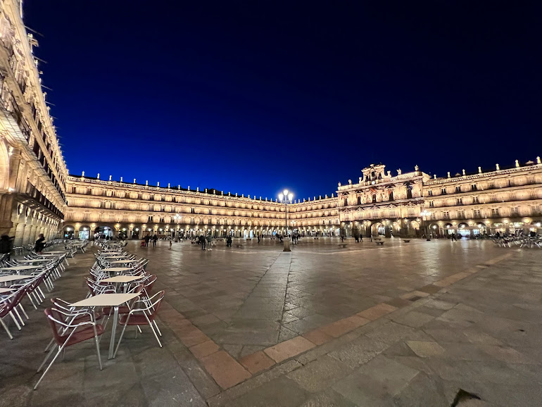 Continuamos caminhando sob frio e chuva em Salamanca, até chegar à Plaza Mayor, construída no século XVIII. É considerada por muitos que visitam a cidade, com a mais bonita da Espanha. É o centro da cidade. Nos seus entornos ficam alguns lugares importantes, como o Palácio Real, o Mercado Central e a Prefeitura.