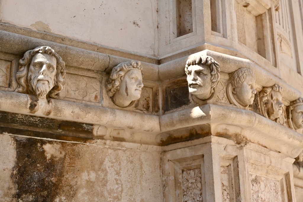 Na fachada exterior existem detalhes com rostos que mostram diferentes expressões de pessoas e que estão muito bem preservadas. São 71 cabeças esculpidas em pedra, todas elas diferentes uma da outra. Sibenik foi uma das cidades da Croácia, escolhida como cenário para as gravações da série Game Of Thrones. Os rostos da Catedral lembram uma passagem da série, com os rostos de Arya Stark
