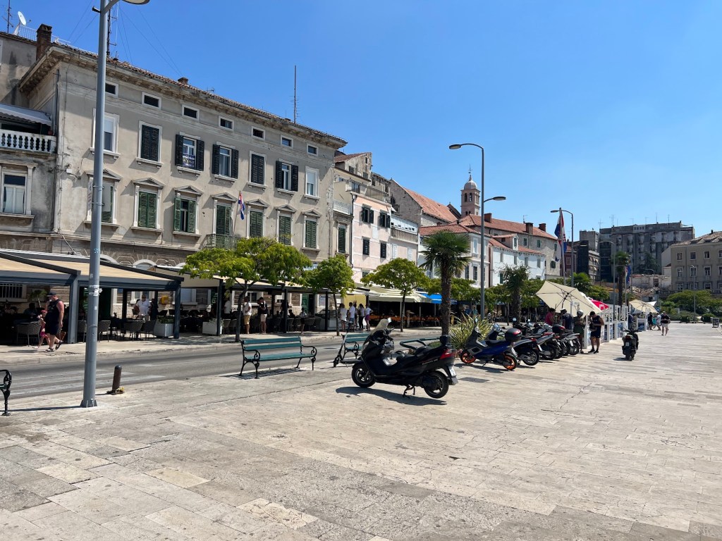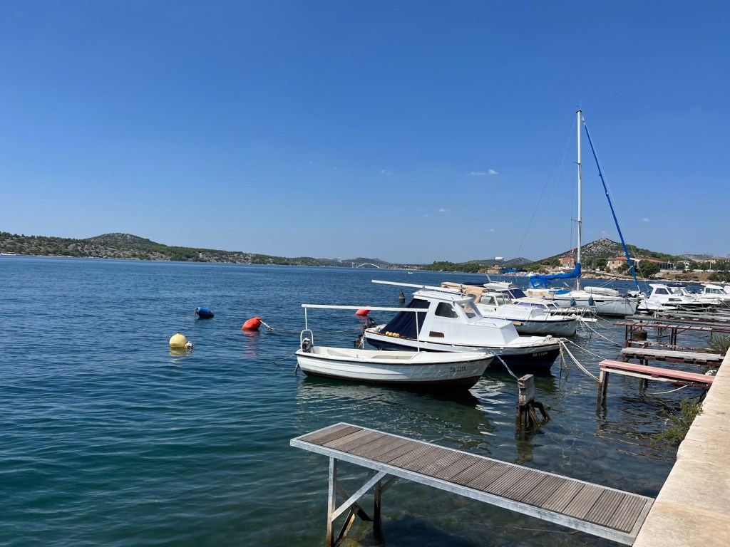 Todo o centro histórico de Sibenik está ao lado do mar. Um largo passeio se estende pela orla. O sol de verão, muito forte, não permitiu que desfrutássemos um pouco mais desse litoral. As marinas, com barcos amarrados, compõem o cenário. Voltamos para o carro e seguimos viagem em direção a Split. Antes, porém, passamos em Trogir.
