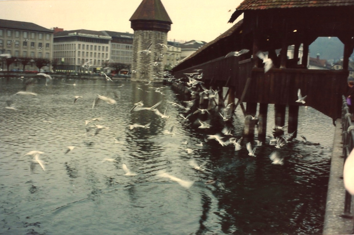Voltamos para Lucerna e passeamos pela cidade onde fotografamos os cisnes que circulam livremente no Lago. Atravessamos a Kapellbrücke, uma ponte de madeira da Idade Média, construída em 1333, com pinturas e afrescos, que é uma das principais atrações da cidade.