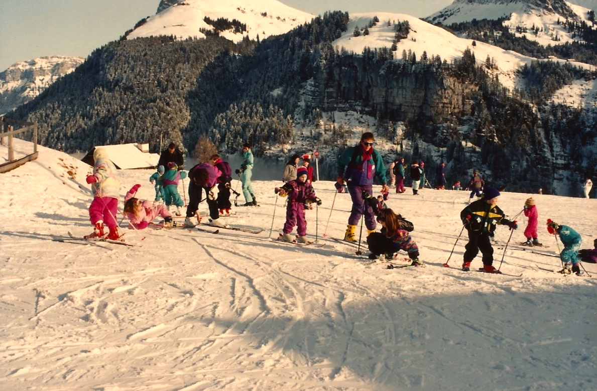 Subimos até uma estação de esqui no alto das montanhas, de lá pegamos um teleférico para concluir o percurso. A paisagem é encantadora, a neve cobre as coníferas e os telhados das casas. Existiam uma série de instrutores trabalhando com crianças.