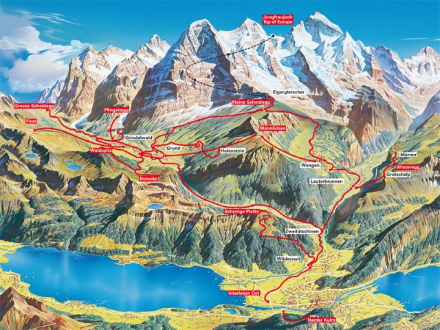 A ferrovia é uma obra de engenharia extraordinária. Começou a ser construída a mais de 100 anos. Para alcançar o objetivo, a solução foi a implantação de vários túneis por dentro das montanhas. Um deles chega a 7,5 quilômetros. No final do túnel chega-se a Jungfraujoch, de onde podemos admirar os picos Jungfrau, Eiger e Mönsch.