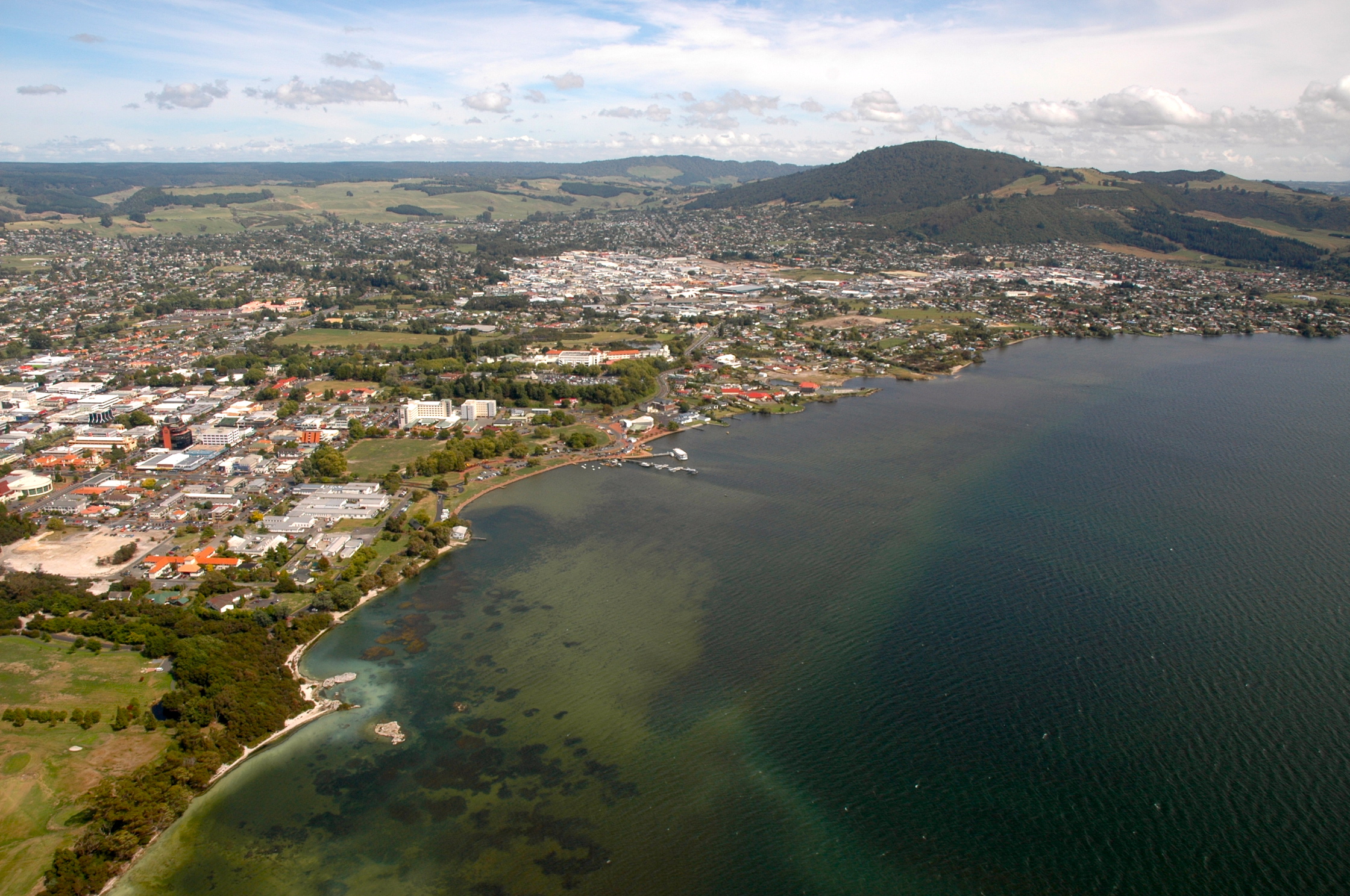 Rotorua fica localizada no centro da Ilha do Norte, nas margens do Lago Rotorua. A cidade tem um cheiro permanente de ovo podre, em função do sulfeto de hidrogênio que exala nas várias fissuras no solo. Fizemos um sobrevôo de helicóptero para avistarmos os gêiseres do alto.